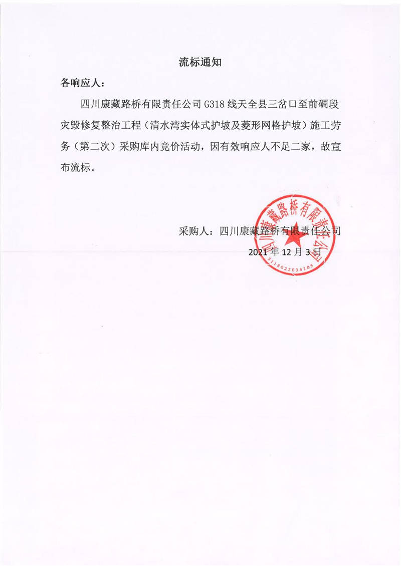 四川康藏路橋有限責(zé)任公司G318線天全縣三岔口至前碉段災(zāi)毀修復(fù)整治工程(清水灣實體式護(hù)坡及菱形網(wǎng)格護(hù)坡)施工勞務(wù)(第二次)采購流標(biāo)通知