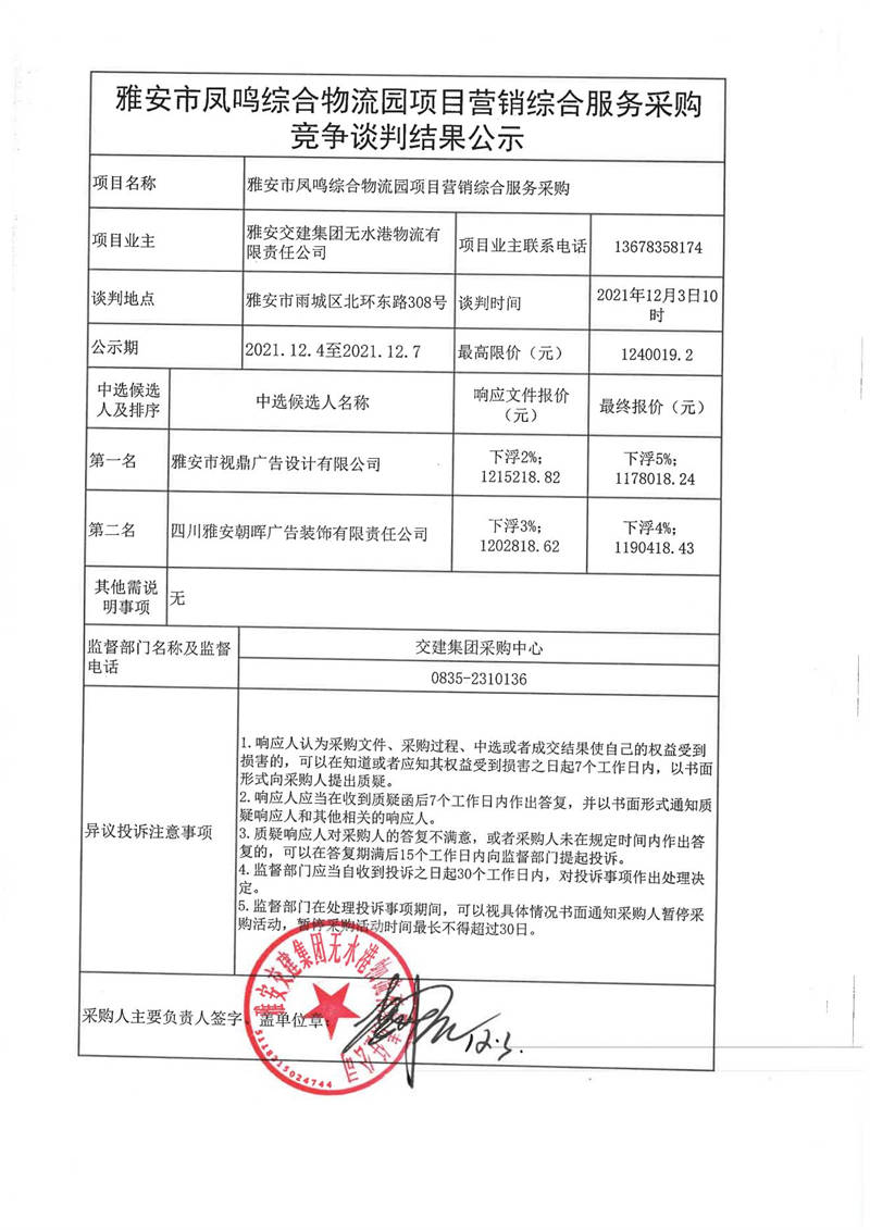 雅安交建集團(tuán)無水港物流有限責(zé)任公司雅安市鳳鳴綜合物流園項目營銷綜合服務(wù)采購競爭談判結(jié)果公示