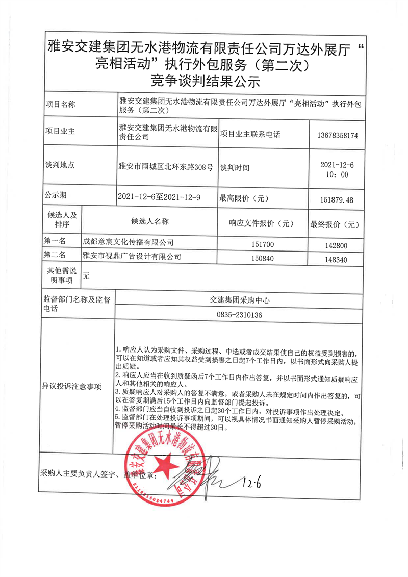 雅安交建集團(tuán)無水港物流有限責(zé)任公司萬達(dá)外展廳“亮相活動(dòng)”執(zhí)行外包服務(wù)(第二次)競(jìng)爭(zhēng)談判結(jié)果公示