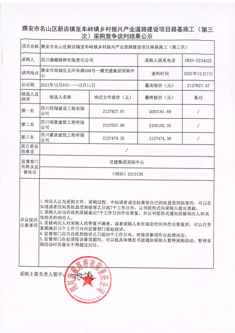 四川康藏路橋有限責(zé)任公司雅安市名山區(qū)新店鎮(zhèn)至車嶺鎮(zhèn)鄉(xiāng)村振興產(chǎn)業(yè)道路建設(shè)項(xiàng)目路面施工(第三次)采購競爭談判結(jié)果公示