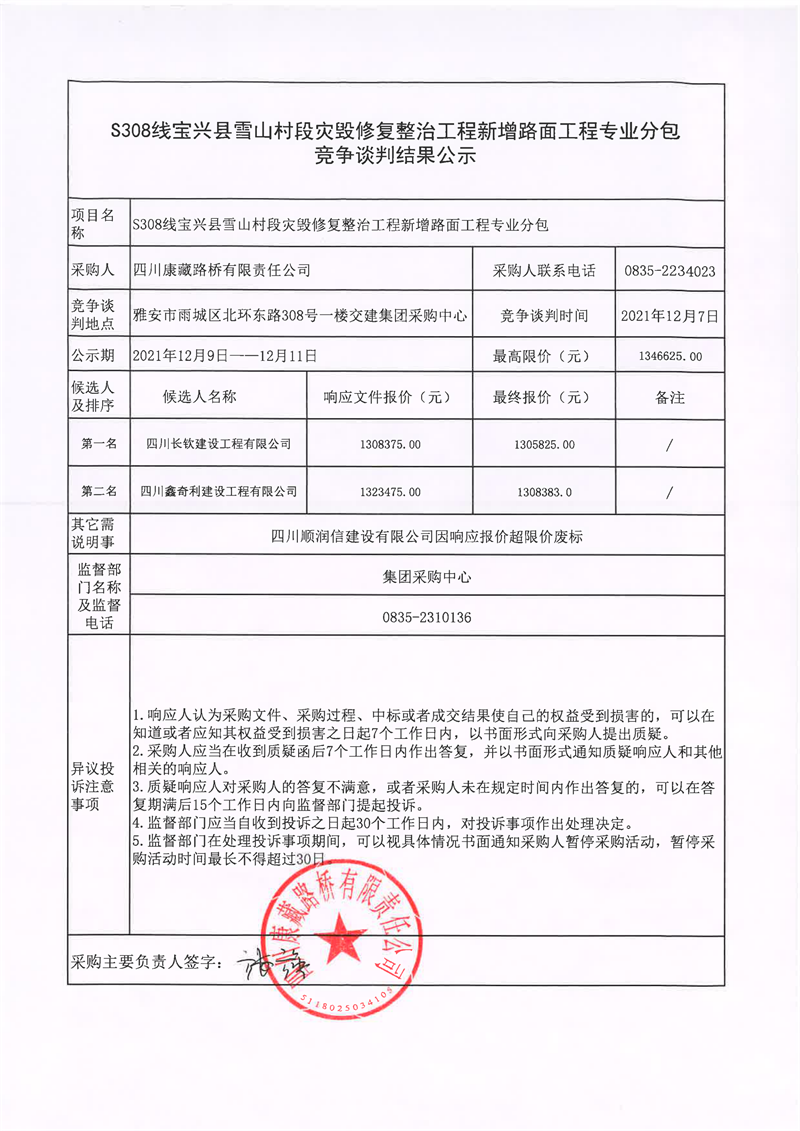 四川康藏路橋有限責任公司S308線寶興縣雪山村段災毀修復整治工程新增路面工程專業(yè)分包競爭談判結(jié)果公示