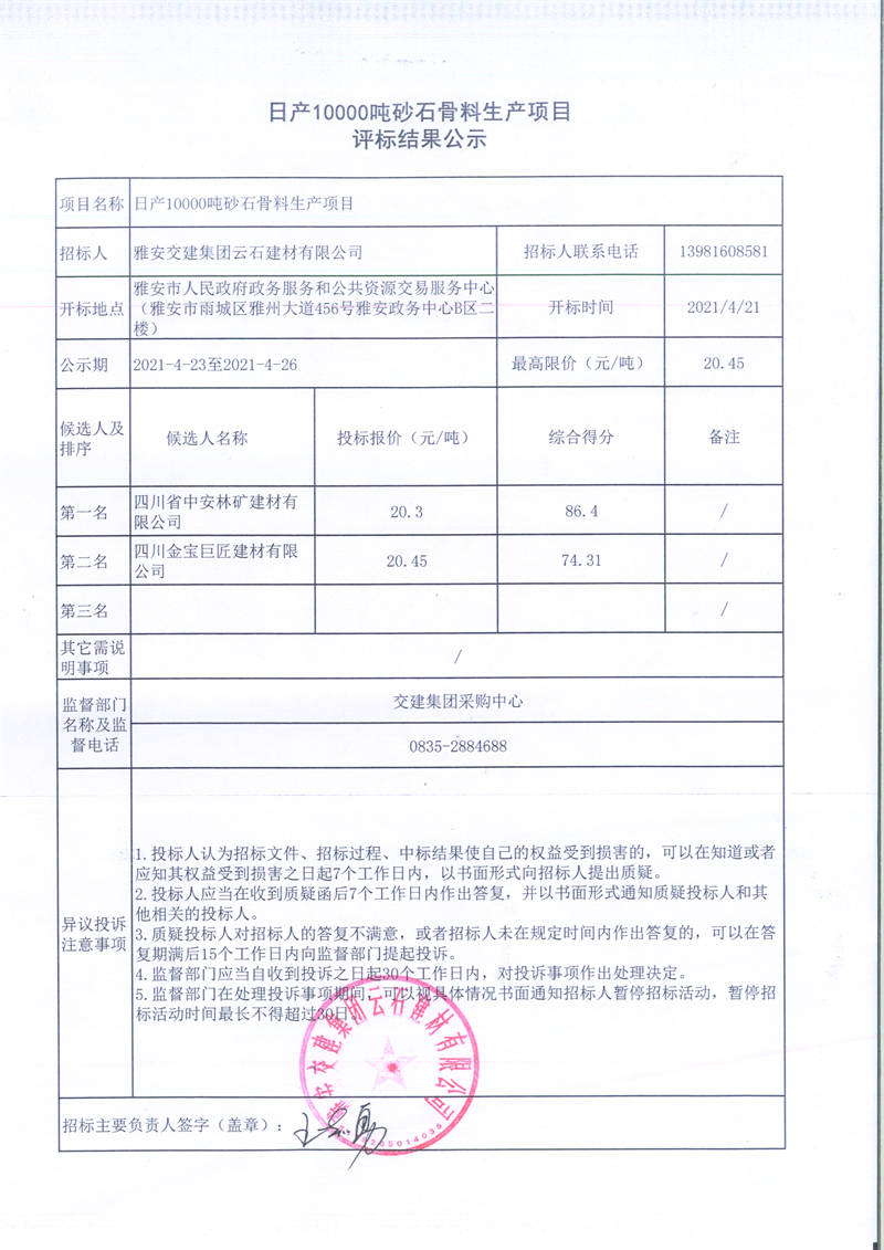 雅安交建集團云石建材有限公司日產(chǎn)10000噸砂石骨料生產(chǎn)項目評標(biāo)結(jié)果公示