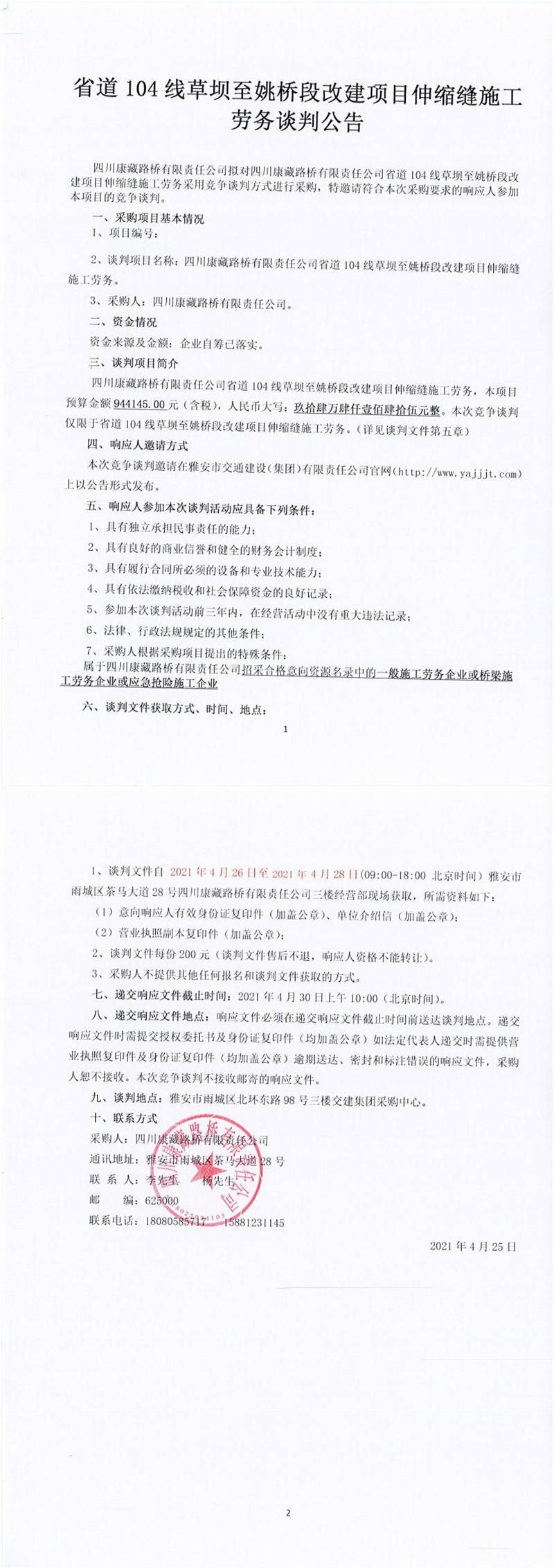 四川康藏路橋有限責(zé)任公司省道104線草壩至姚橋段改建項目伸縮縫施工勞務(wù)談判公告