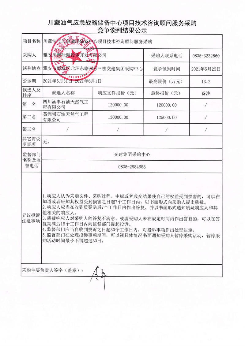雅安川西能源投資開發(fā)有限公司川藏油氣應(yīng)急戰(zhàn)略儲(chǔ)備中心項(xiàng)目技術(shù)咨詢顧問(wèn)服務(wù)采購(gòu)競(jìng)爭(zhēng)談判結(jié)果公示