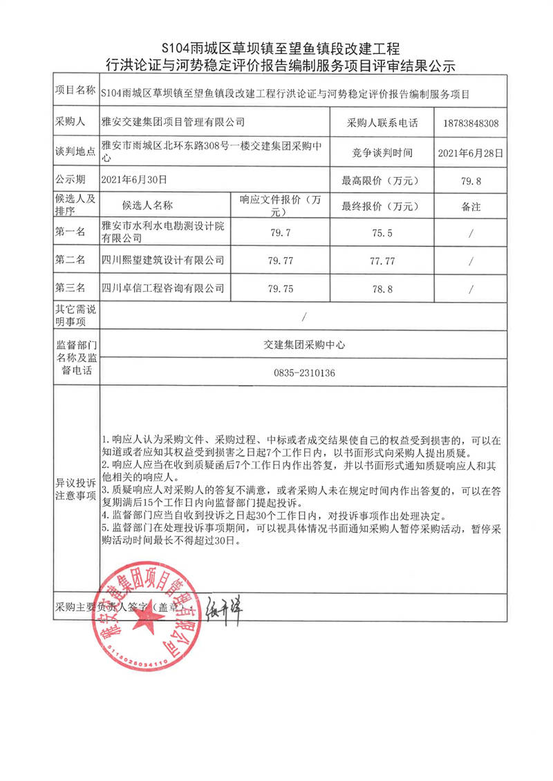 雅安交建集團(tuán)項目管理有限公司S104雨城區(qū)草壩鎮(zhèn)至望魚鎮(zhèn)段改建工程行洪論證與河勢穩(wěn)定評價報告編制服務(wù)項目評審結(jié)果公示