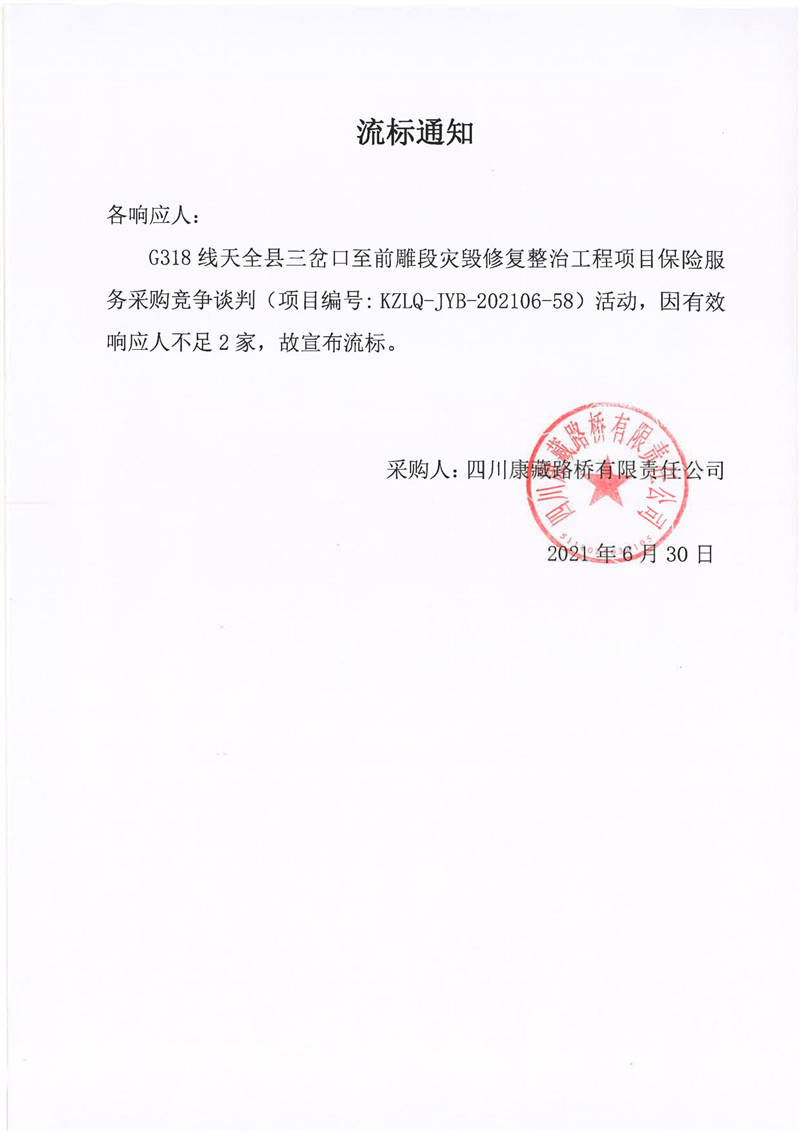 四川康藏路橋有限責任公司G318線天全縣三岔口至前雕段災毀修復整治工程項目保險服務采購流標通知