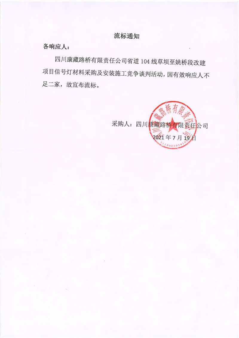 四川康藏路橋有限責(zé)任公司省道104線草壩至姚橋段改建項目信號燈材料采購及安裝施工競爭談判流標通知