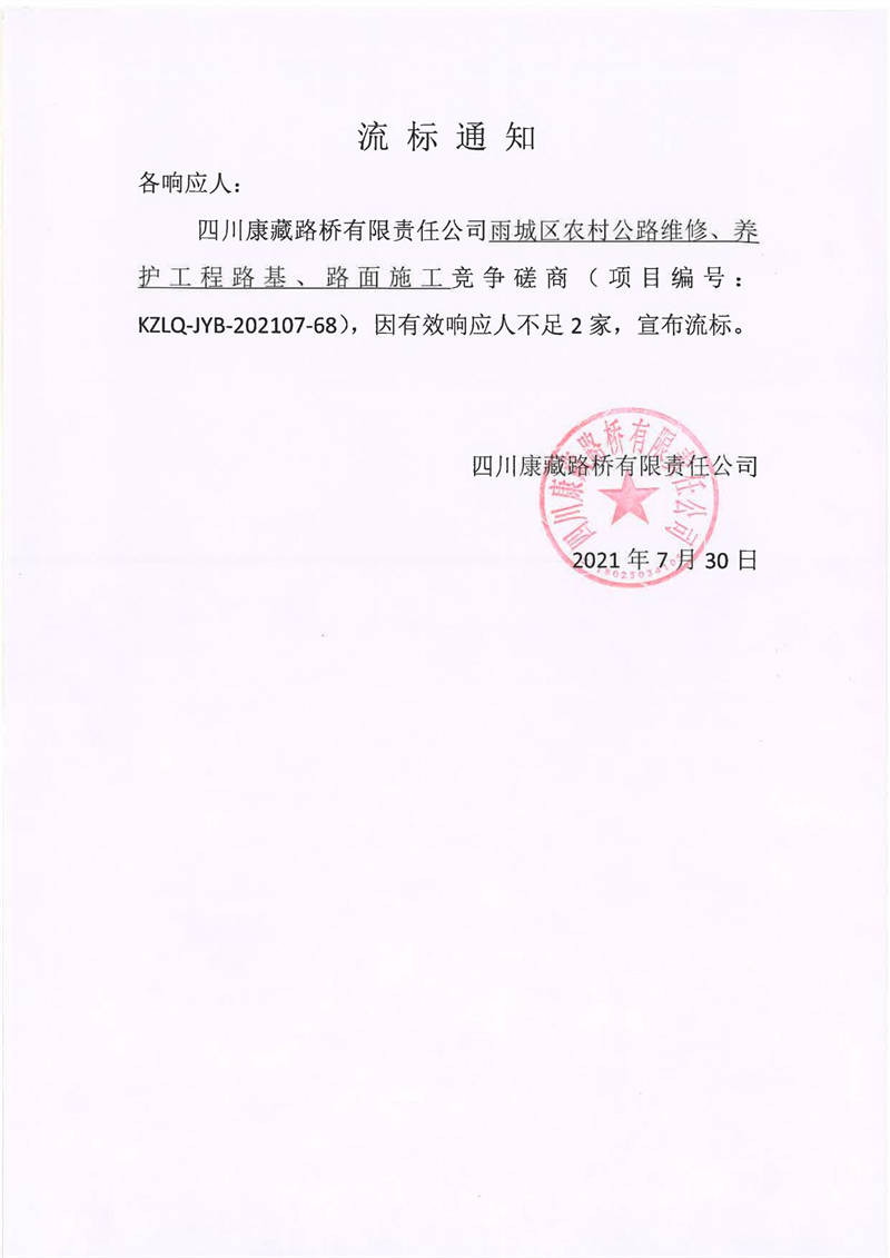 四川康藏路橋有限責任公司雨城區(qū)農(nóng)村公路維修、養(yǎng)護工程路基、路面施工競爭磋商流標通知
