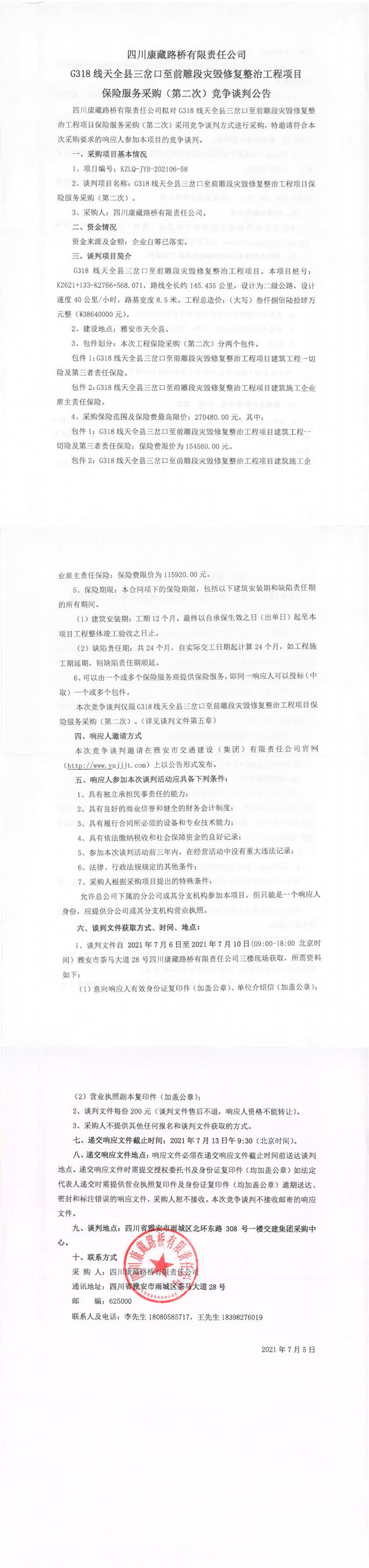 四川康藏路橋有限責任公司G318線天全縣三岔口至前雕段災(zāi)毀修復(fù)整治工程項目保險服務(wù)采購(第二次)競爭談判公告
