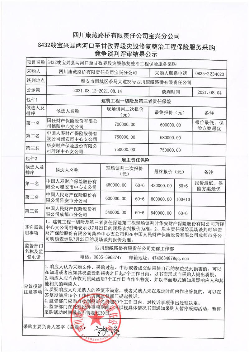 四川康藏路橋有限責任公司寶興分公司S432線寶興縣兩河口至甘孜界段災毀修復整治工程保險服務采購競爭談判評審結果公示