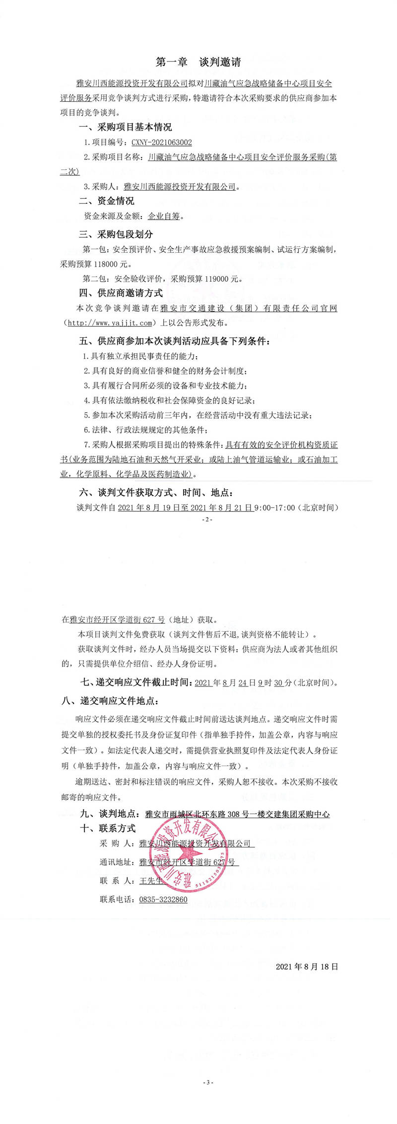 雅安川西能源投資開發(fā)有限公司川藏油氣應(yīng)急戰(zhàn)略儲(chǔ)備中心項(xiàng)目安全評(píng)價(jià)服務(wù)采購(gòu)(第二次)競(jìng)爭(zhēng)談判公告