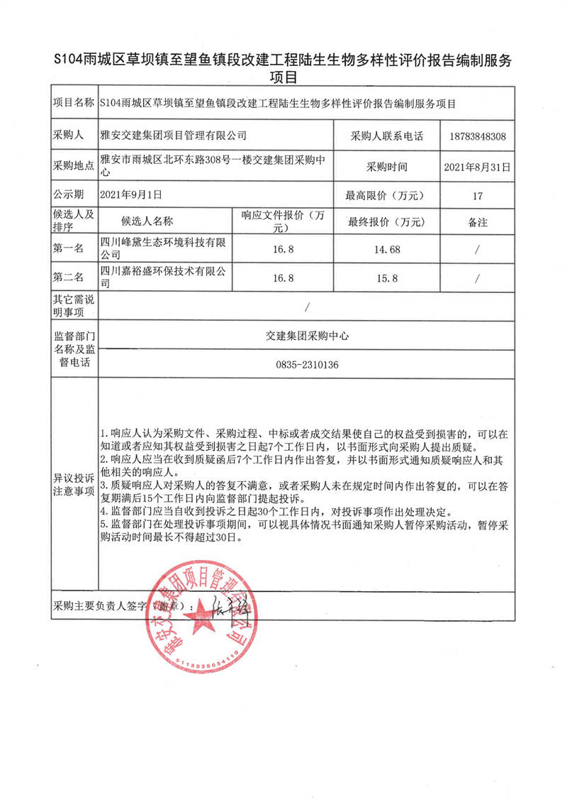雅安交建集團(tuán)項(xiàng)目管理有限公司S104雨城區(qū)草壩鎮(zhèn)至望魚鎮(zhèn)段改建工程陸生生物多樣性評價報(bào)告編制服務(wù)項(xiàng)目評審結(jié)果公示