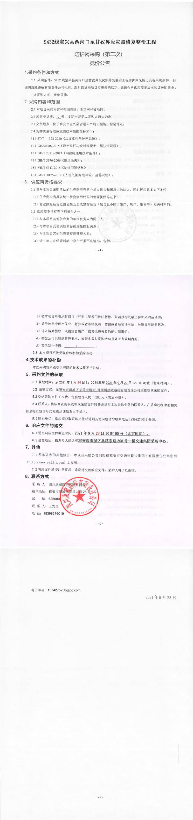 四川康藏路橋有限責(zé)任公司S432線寶興縣兩河口至甘孜界段災(zāi)毀修復(fù)整治工程防護(hù)網(wǎng)采購(第二次)競(jìng)價(jià)公告