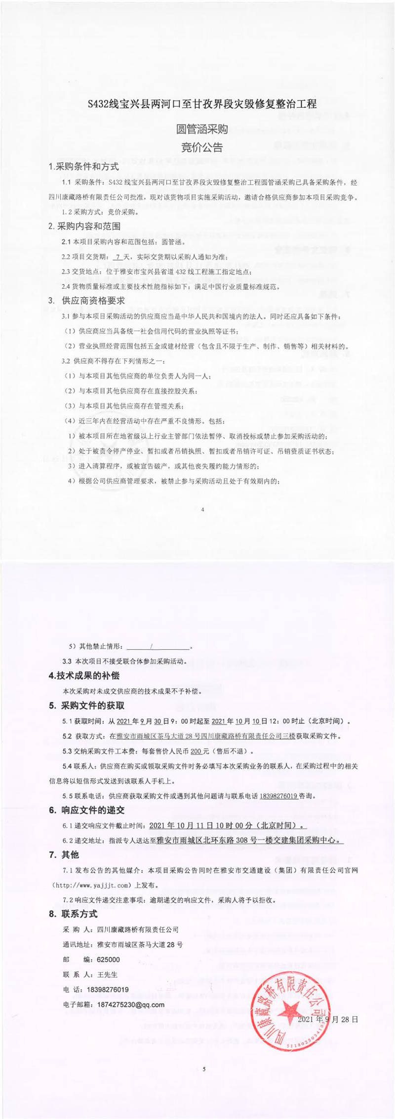 四川康藏路橋有限責(zé)任公司S432線(xiàn)寶興縣兩河口至甘孜界段災(zāi)毀修復(fù)整治工程圓管涵采購(gòu)競(jìng)價(jià)公告