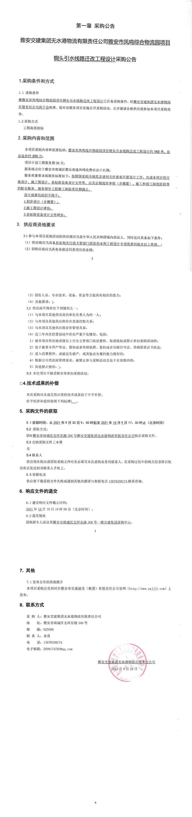 雅安交建集團(tuán)無水港物流有限責(zé)任公司雅安市鳳鳴綜合物流園項(xiàng)目銅頭引水線路遷改工程設(shè)計(jì)采購(gòu)公告