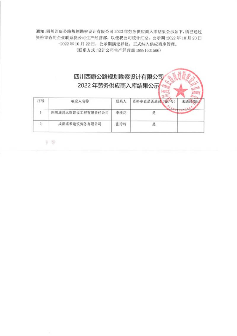 四川西康公路規(guī)劃勘察設(shè)計(jì)有限公司2022年勞務(wù)供應(yīng)商入庫結(jié)果公示