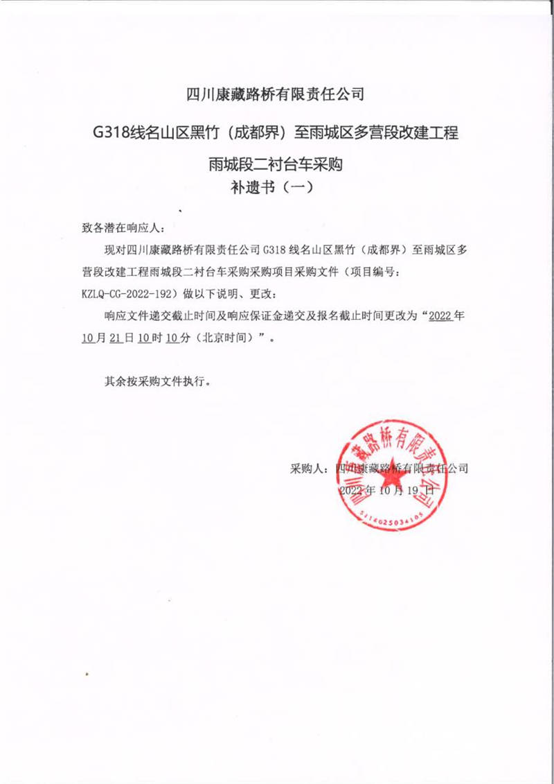 四川康藏路橋有限責(zé)任公司G318線名山區(qū)黑竹(成都界)至雨城區(qū)多營(yíng)段改建工程雨城段二襯臺(tái)車采購(gòu)補(bǔ)遺書(一)