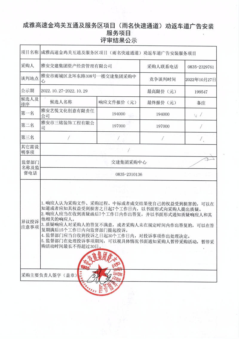 雅安交建集團資產經營管理有限公司成雅高速金雞關互通及服務區(qū)項目(雨名快速通道)勸返車道廣告安裝服務項目評審結果公示