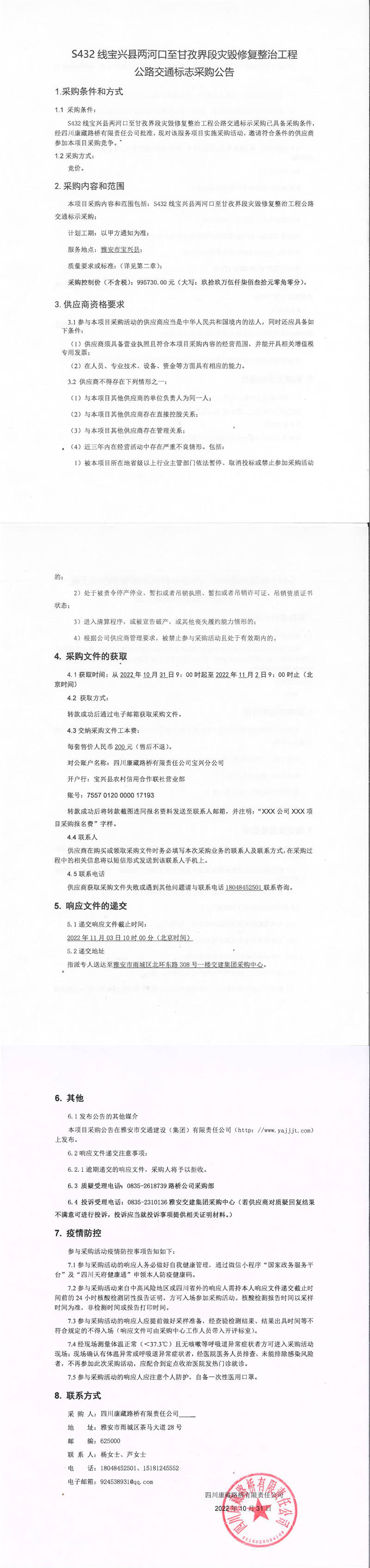 四川康藏路橋有限責任公司S432線寶興縣兩河口至甘孜界段災毀修復整治工程公路交通標志采購公告