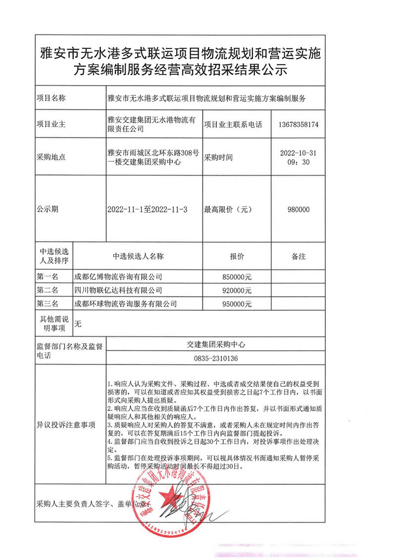 雅安交建集團無水港物流有限責(zé)任公司雅安市無水港多式聯(lián)運項目物流規(guī)劃和營運實施方案編制服務(wù)經(jīng)營高效招采結(jié)果公示