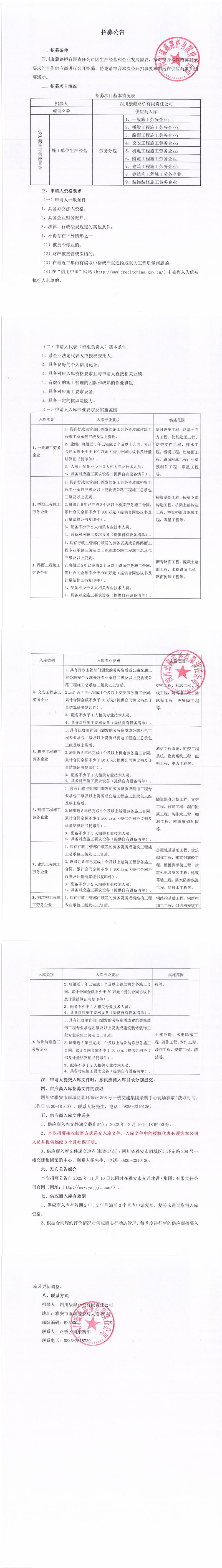 四川康藏路橋有限責任公司2022年第四季度供應(yīng)商入庫招募公告