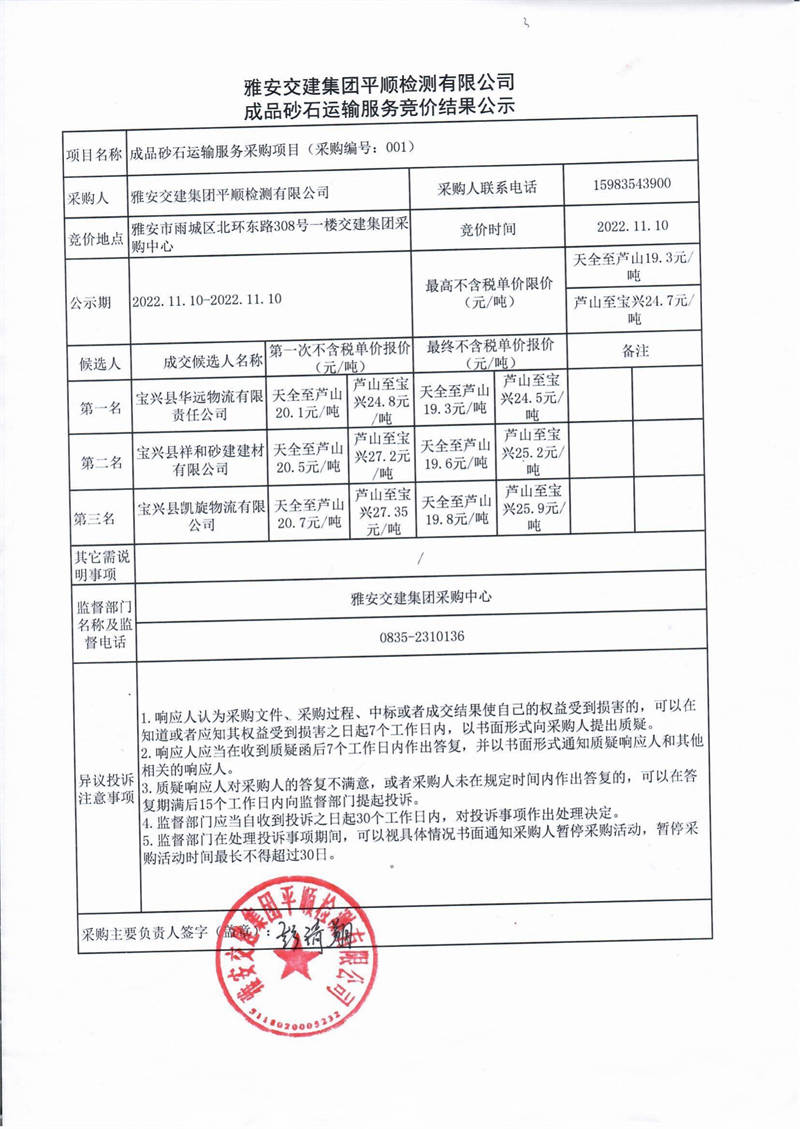 雅安交建集團平順檢測有限公司成品砂石運輸服務(wù)競價結(jié)果公示