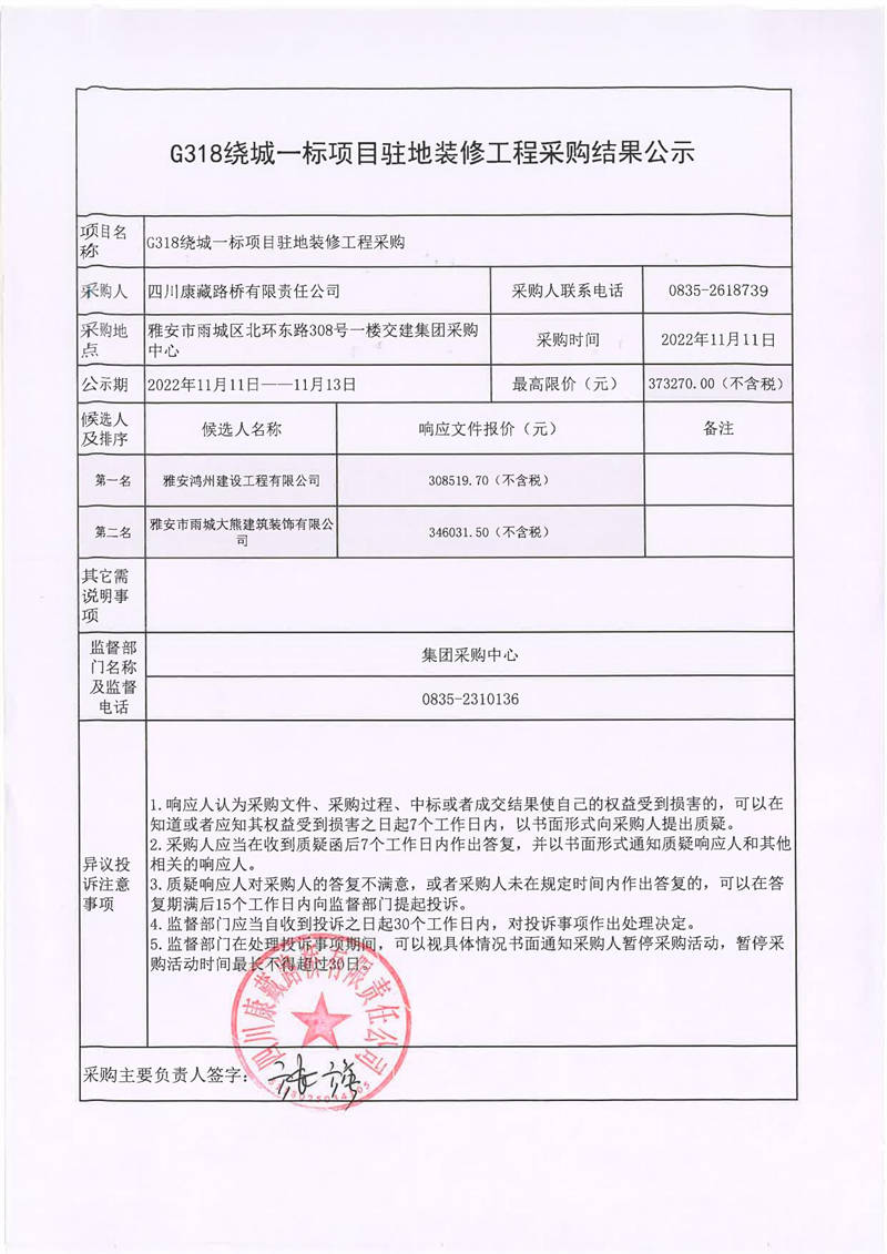 四川康藏路橋有限責(zé)任公司G318繞城一標(biāo)項(xiàng)目駐地裝修工程采購結(jié)果公示