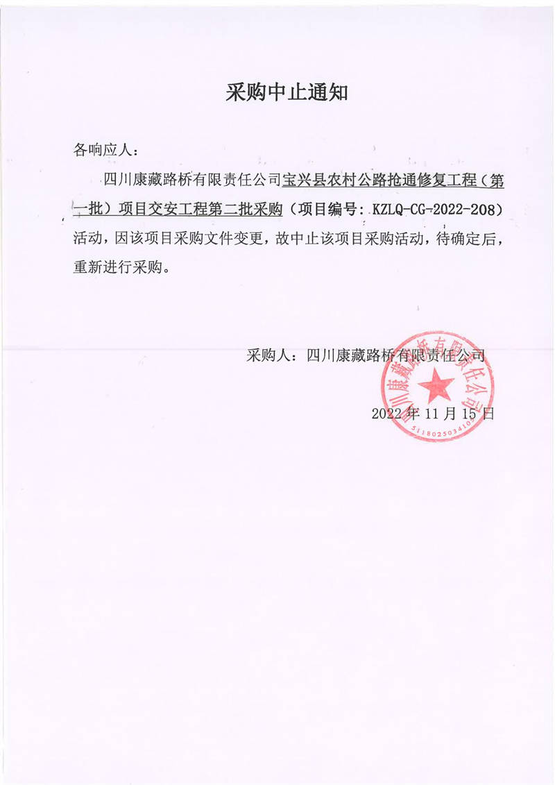 四川康藏路橋有限責(zé)任公司寶興縣農(nóng)村公路搶通修復(fù)工程(第一批)項目交安工程第二批采購中止通知
