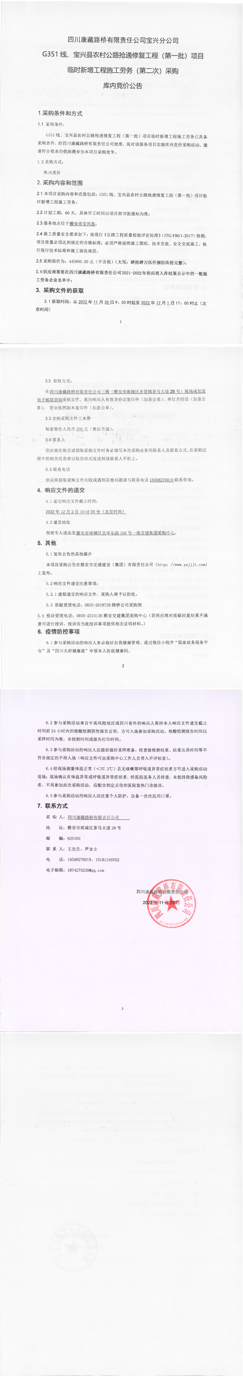 四川康藏路橋有限責(zé)任公司G351線、寶興縣農(nóng)村公路搶通修復(fù)工程(第一批)項(xiàng)目臨時(shí)新增工程施工勞務(wù)(第二次)采購庫內(nèi)競(jìng)價(jià)公告