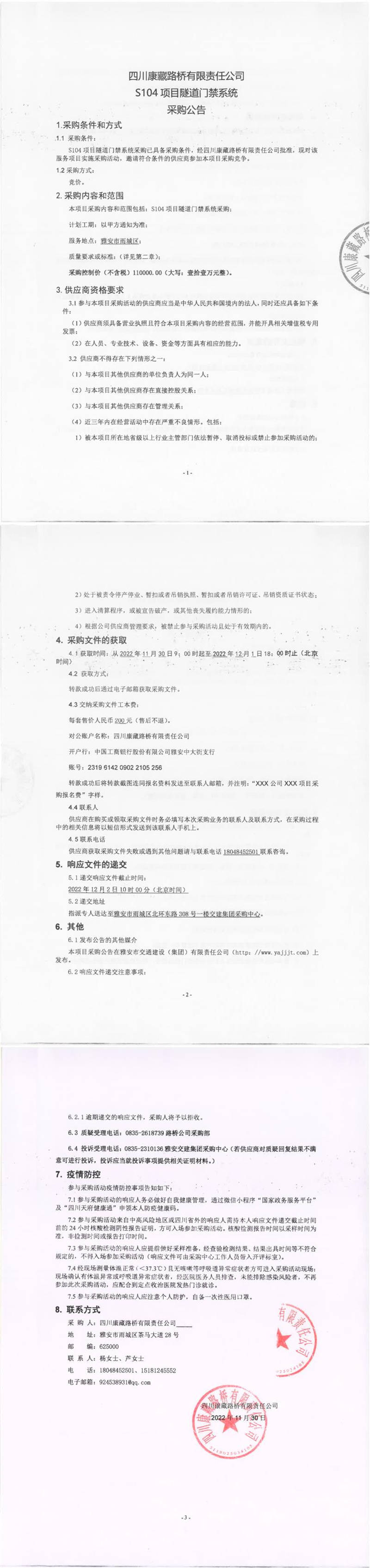 四川康藏路橋有限責任公司S104項目隧道門禁系統(tǒng)采購公告