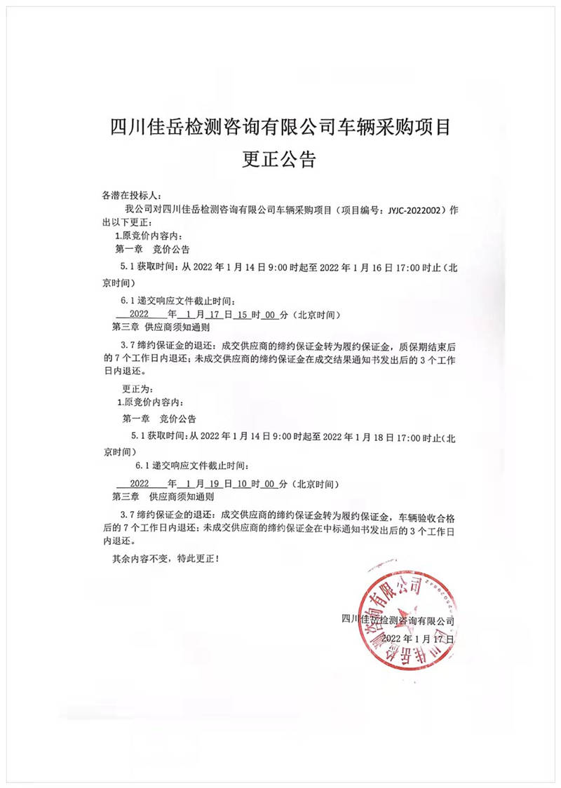 四川佳岳檢測(cè)咨詢有限公司車輛采購(gòu)項(xiàng)目更正公告