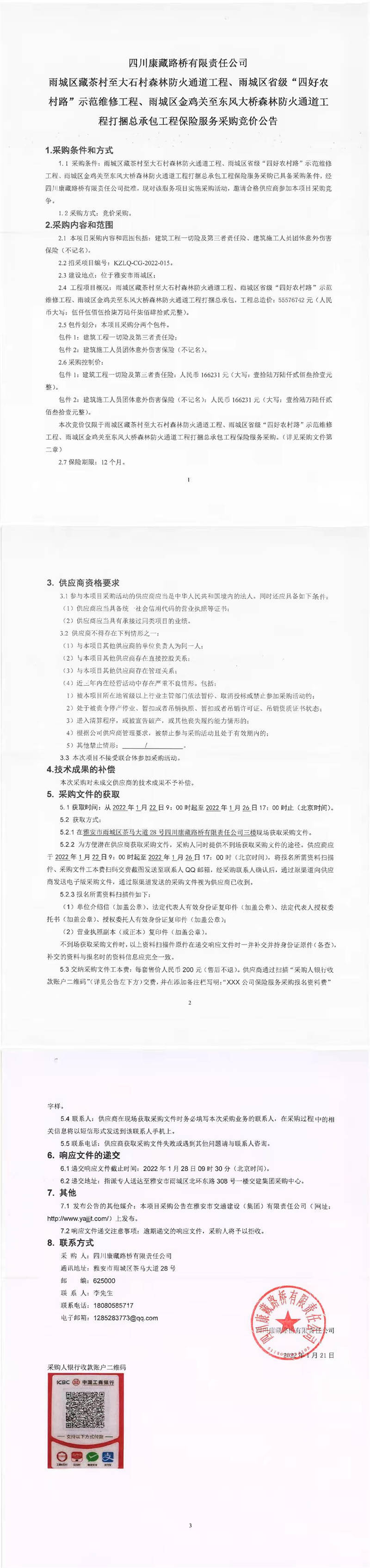 四川康藏路橋有限責(zé)任公司雨城區(qū)藏茶村至大石村森林防火通道工程、雨城區(qū)省級(jí)“四好農(nóng)村路”示范維修工程、雨城區(qū)金雞關(guān)至東風(fēng)大橋森林防火通道工程打捆總承包工程保險(xiǎn)服務(wù)采購競價(jià)公告
