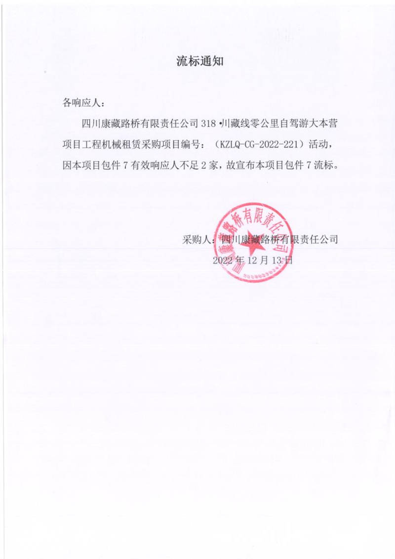 四川康藏路橋有限責任公司318.川藏線零公里自駕游大本營項目工程機械租賃采購(包件7)流標通知
