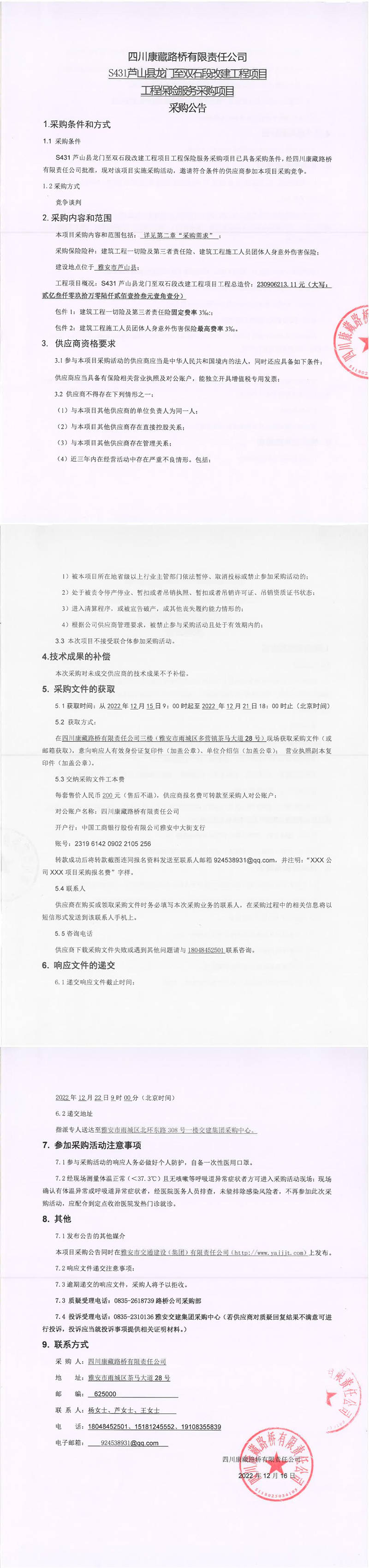 四川康藏路橋有限責(zé)任公司S431蘆山縣龍門至雙石段改建工程項(xiàng)目工程保險服務(wù)采購項(xiàng)目采購公告