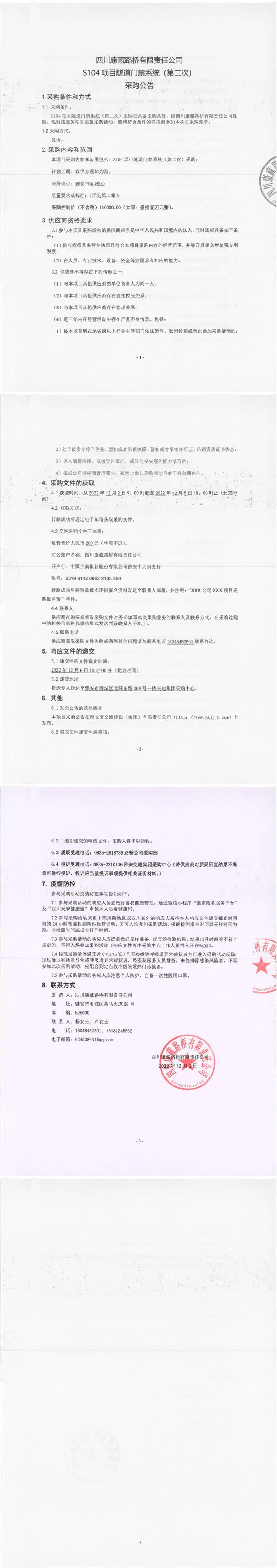 四川康藏路橋有限責(zé)任公司S104項(xiàng)目隧道門(mén)禁系統(tǒng)(第二次)采購(gòu)公告
