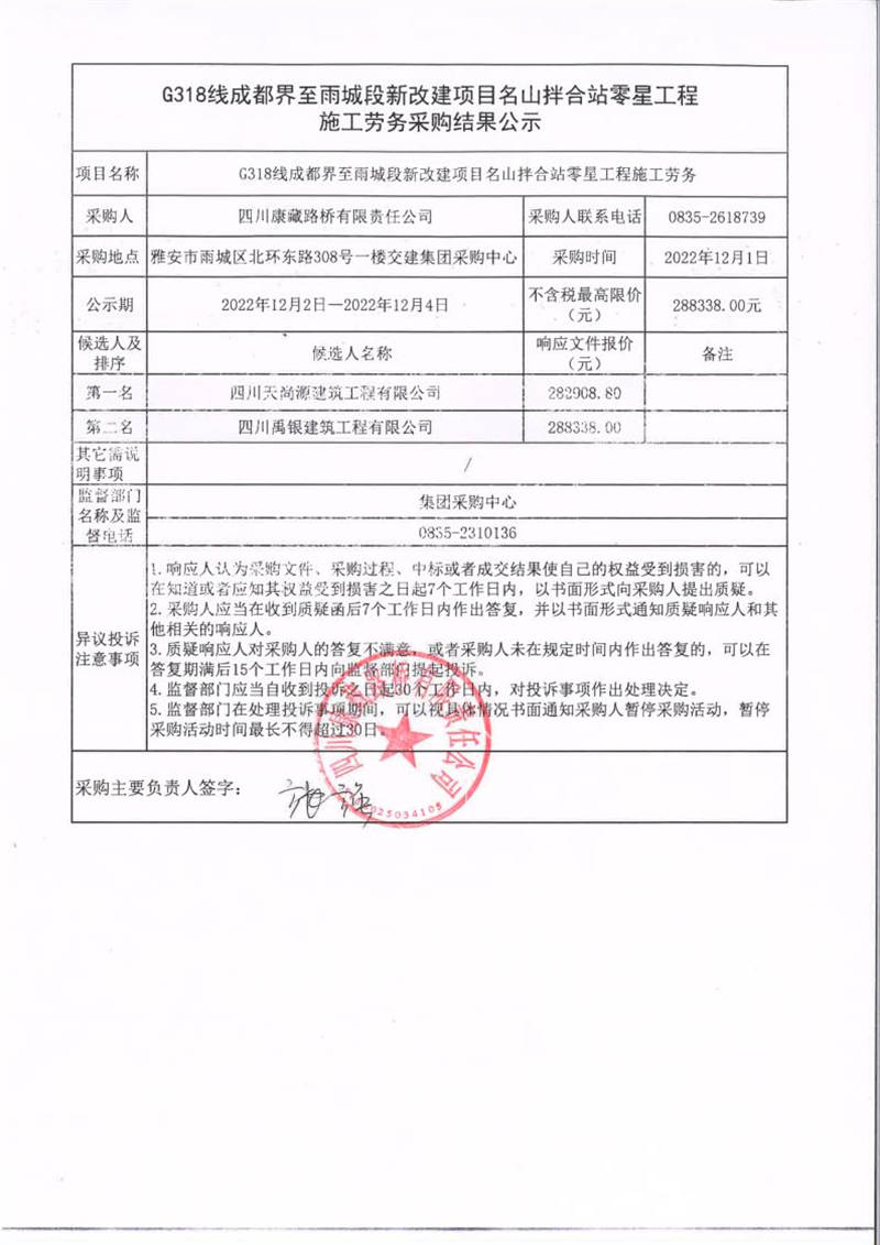 四川康藏路橋有限責(zé)任公司G318線成都界至雨城段新改建項(xiàng)目名山拌合站零星工程施工勞務(wù)采購(gòu)結(jié)果公示