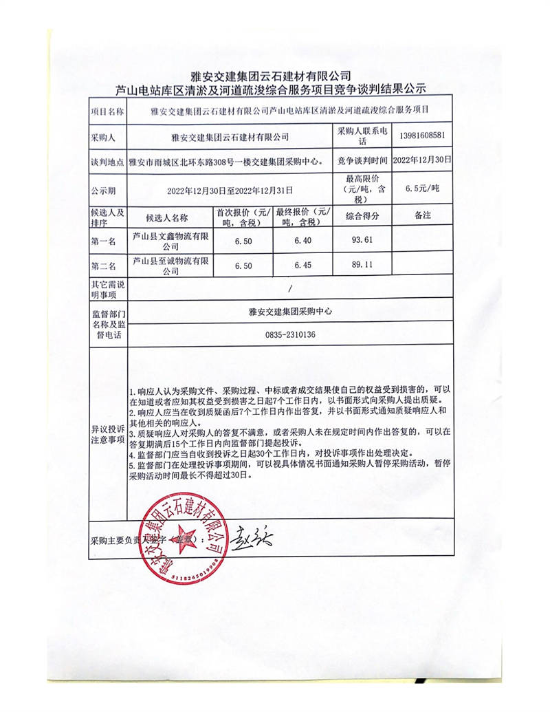 雅安交建集團(tuán)云石建材有限公司蘆山電站庫區(qū)清淤及河道疏浚綜合服務(wù)項目競爭談判結(jié)果公示