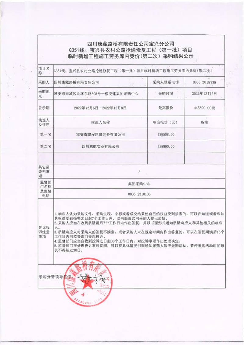 四川康藏路橋有限責(zé)任公司寶興分公司G351線、寶興縣農(nóng)村公路搶通修復(fù)工程(第一批)項(xiàng)目臨時(shí)新增工程施工勞務(wù)庫內(nèi)競(jìng)價(jià)(第二次)采購結(jié)果公示