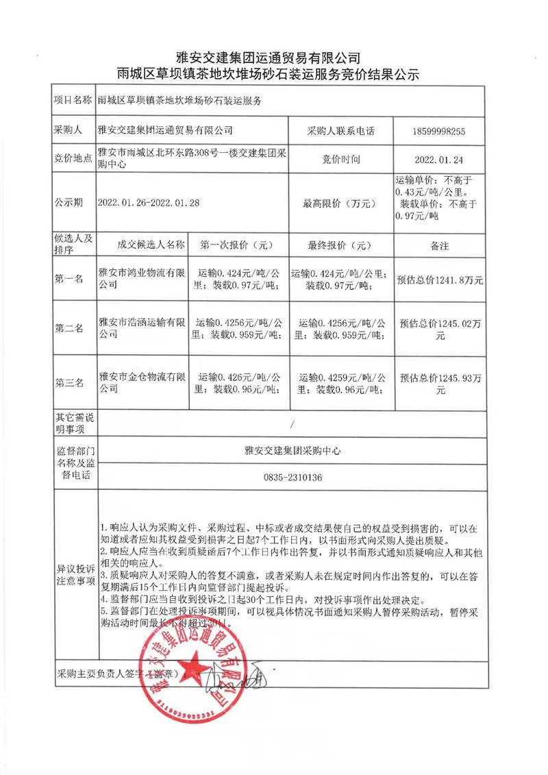 雅安交建集團運通貿易有限公司雨城區(qū)草壩鎮(zhèn)茶地坎堆場砂石裝運服務競價結果公示