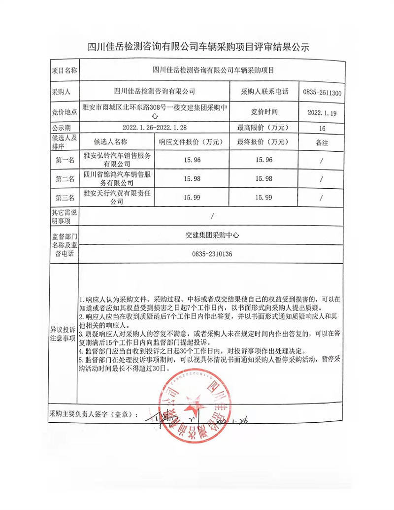 四川佳岳檢測咨詢有限公司車輛采購項目評審結(jié)果公示