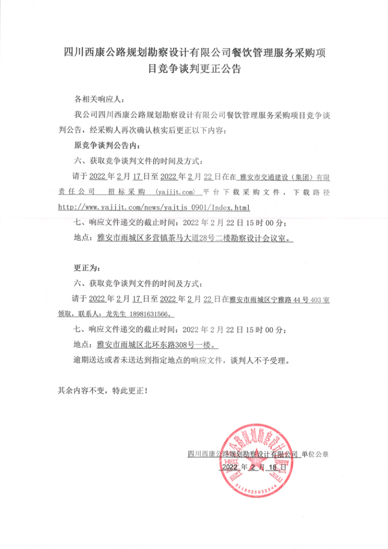四川西康公路規(guī)劃勘察設(shè)計(jì)有限公司餐飲管理服務(wù)采購(gòu)項(xiàng)目競(jìng)爭(zhēng)談判更正公告