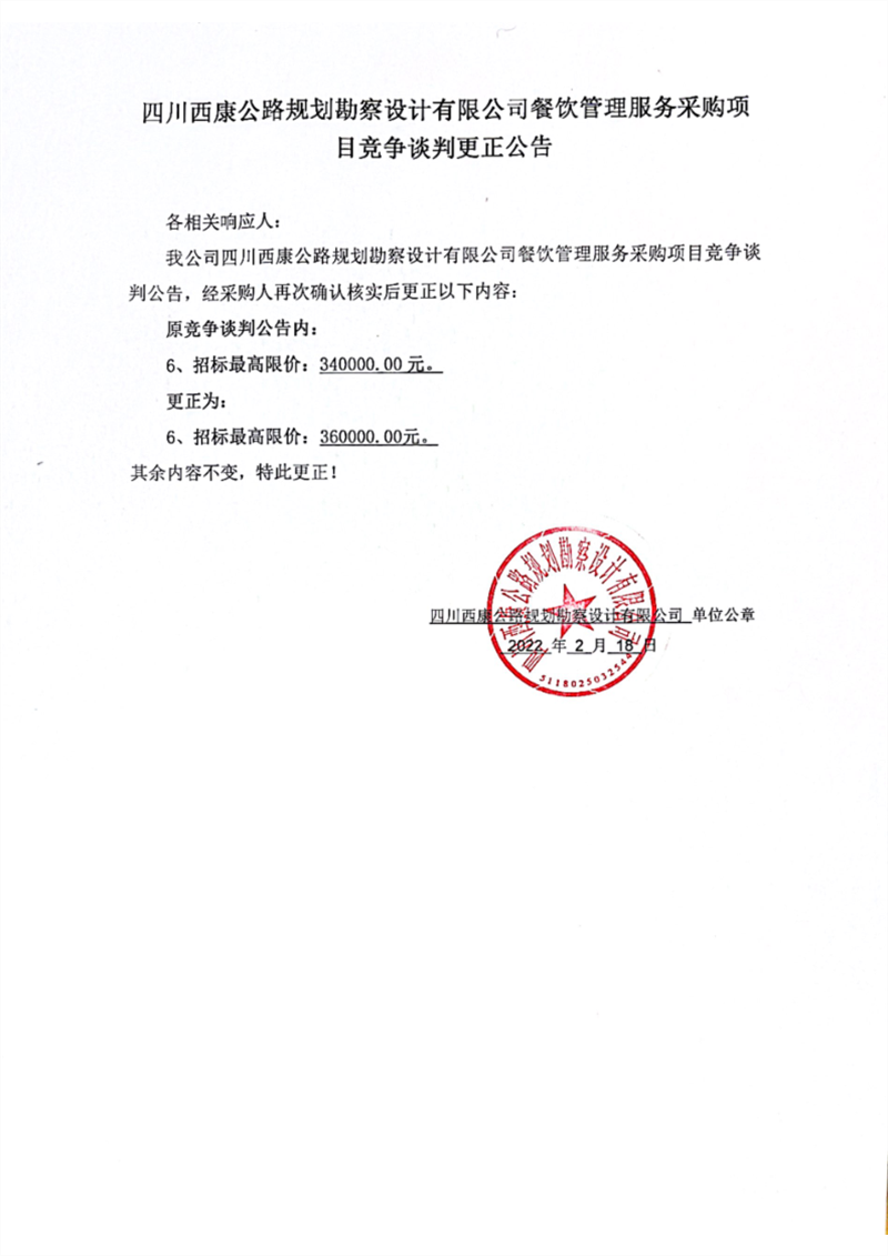 四川西康公路規(guī)劃勘察設(shè)計有限公司餐飲管理服務采購項目競爭談判更正公告(第二次)