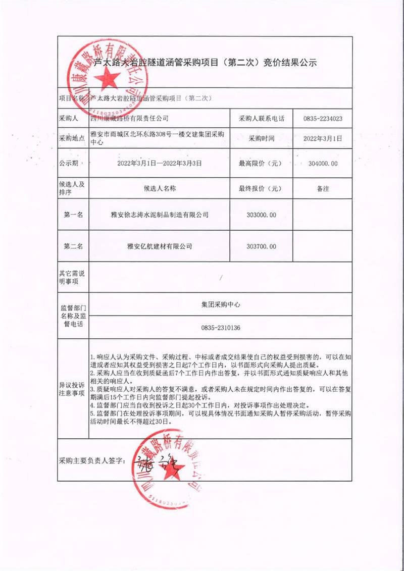 四川康藏路橋有限責任公司蘆太路大巖腔隧道涵管采購項目(第二次)競價結果公示