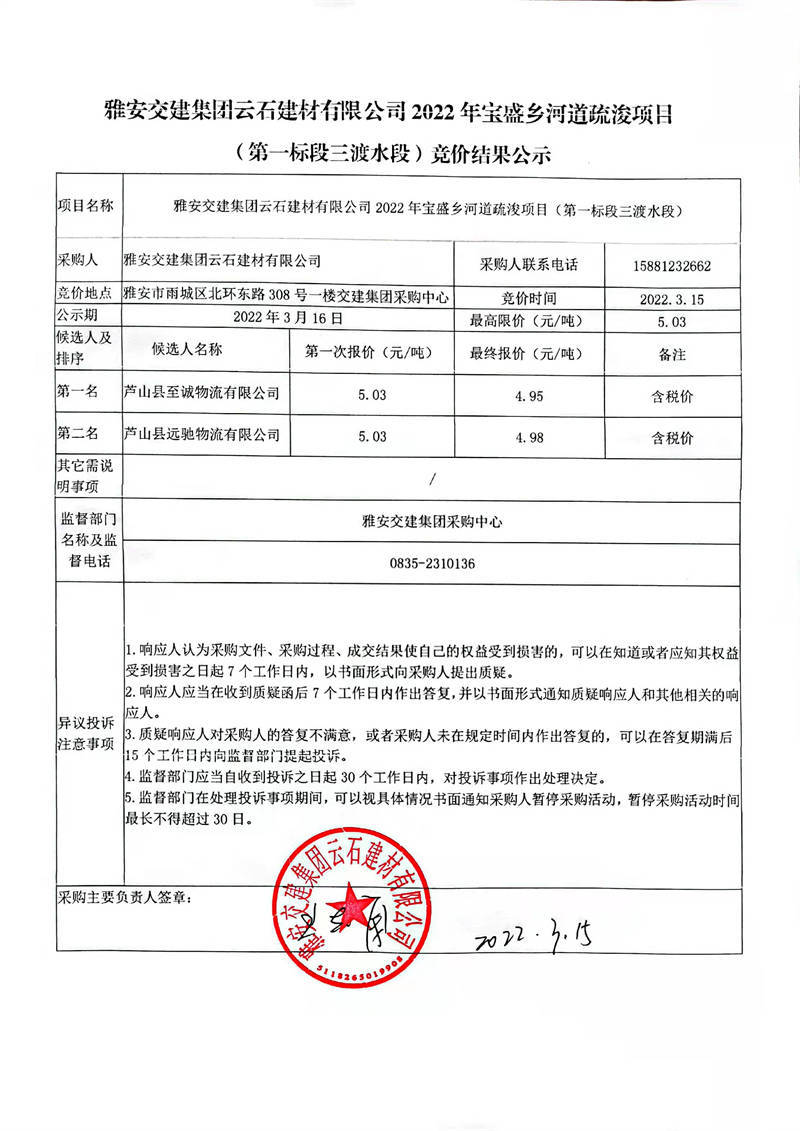 雅安交建集團云石建材有限公司2022年寶盛鄉(xiāng)河道疏浚項目(第一標(biāo)段三渡水段)競價結(jié)果公示