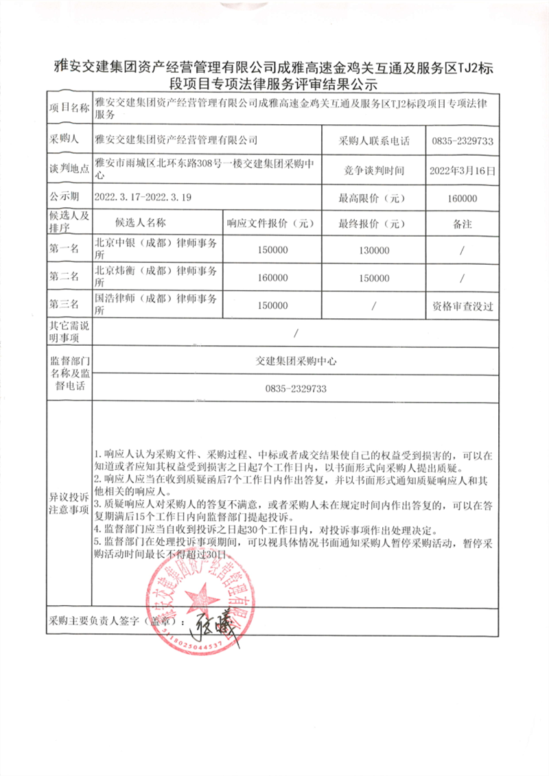 雅安交建集團資產(chǎn)經(jīng)營管理有限公司成雅高速金雞關(guān)互通及服務(wù)區(qū)TJ2標(biāo)段項目專項法律服務(wù)評審結(jié)果公示