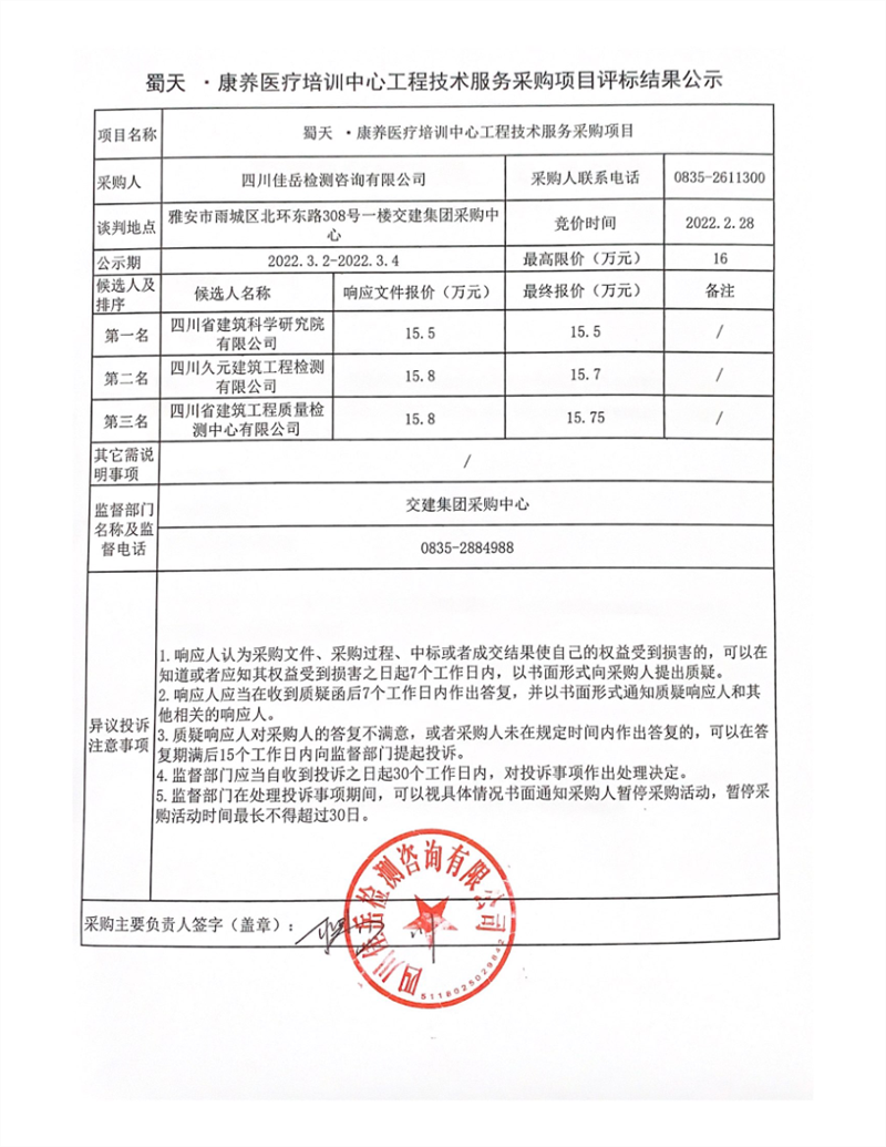 四川佳岳檢測咨詢有限公司蜀天.康養(yǎng)醫(yī)療培訓中心工程技術服務采購項目評標結果公示