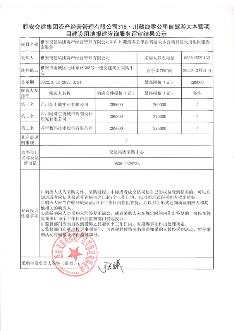 雅安交建集團(tuán)資產(chǎn)經(jīng)營管理有限公司318川藏線零公里自駕游大本營項目建設(shè)用地報建咨詢服務(wù)評審結(jié)果公示