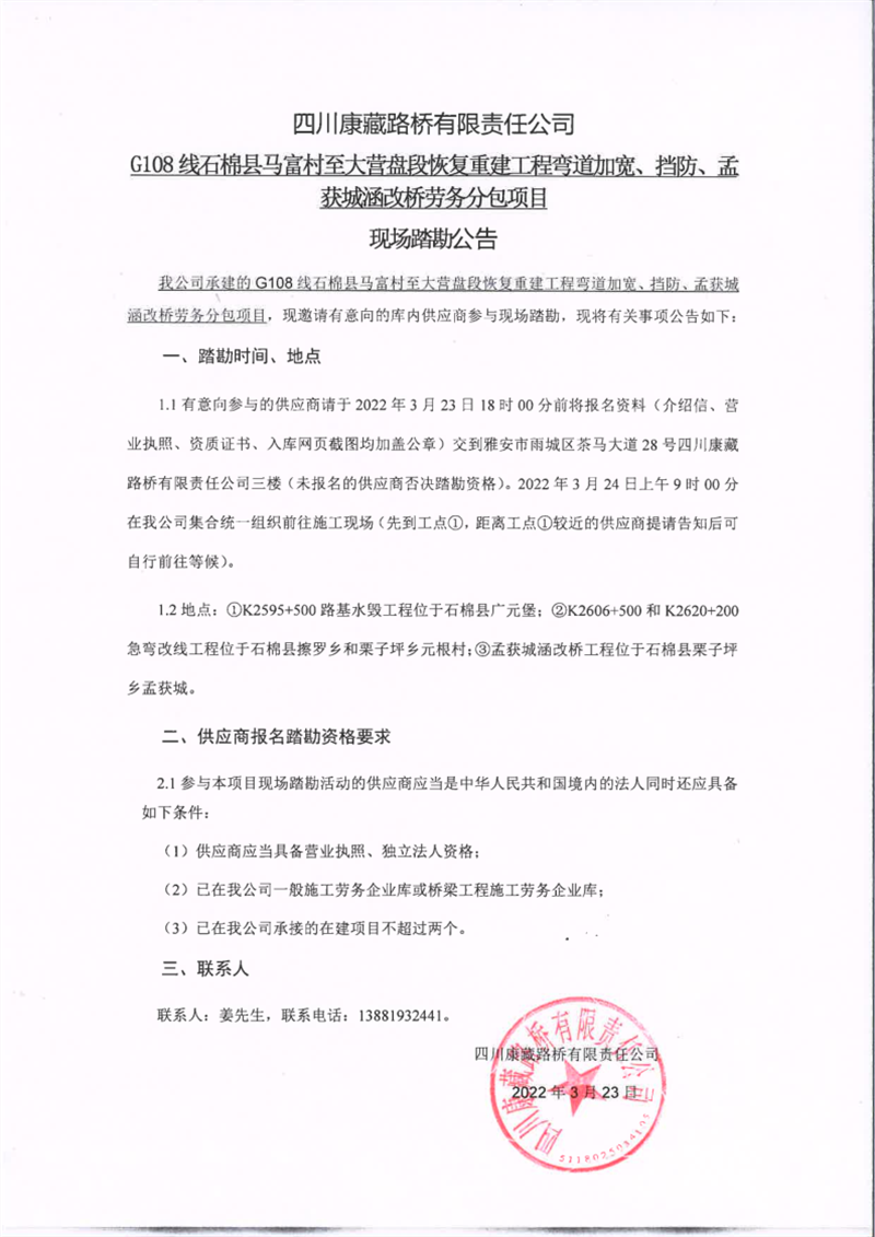 四川康藏路橋有限責(zé)任公司G108線石棉縣馬富村至大營(yíng)盤(pán)段恢復(fù)重建工程彎道加寬、擋防、孟獲城涵改橋勞務(wù)分包項(xiàng)目現(xiàn)場(chǎng)踏勘公告