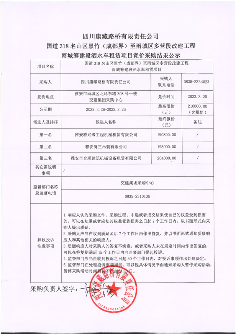 四川康藏路橋有限責任公司國道318名山區(qū)黑竹(成都界)至雨城區(qū)多營段改建工程雨城籌建段灑水車租賃項目競價采購結(jié)果公示