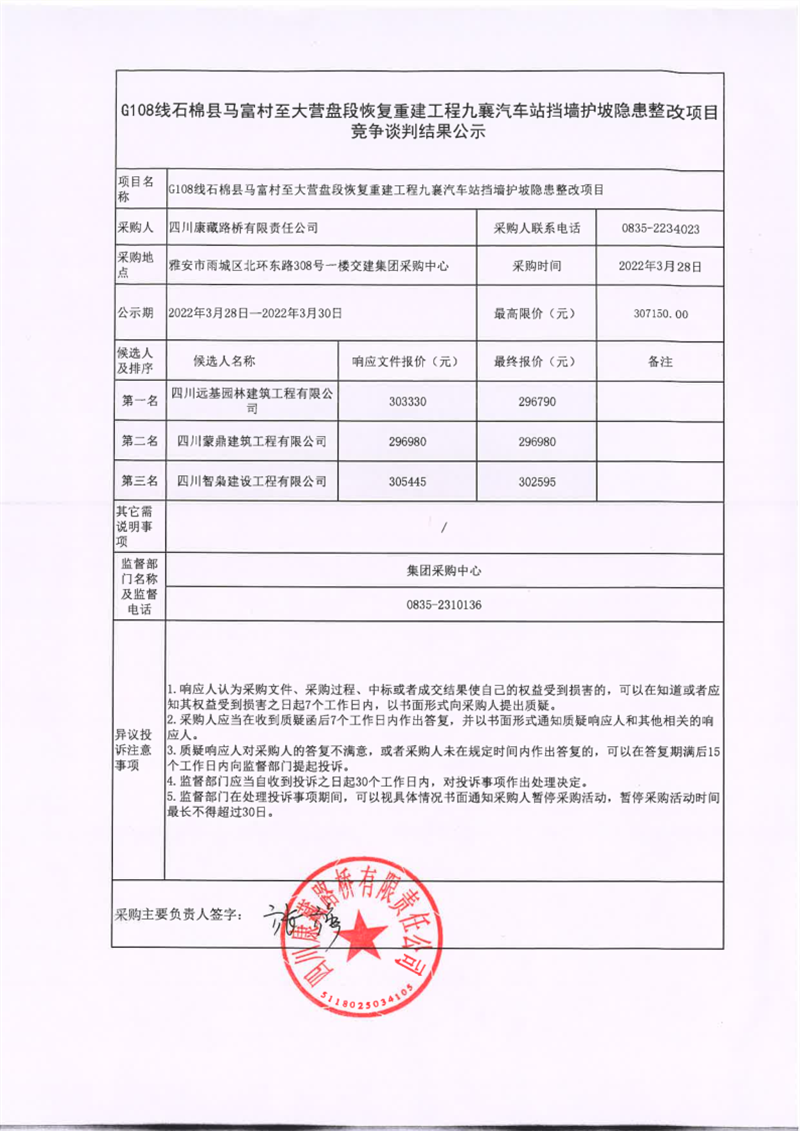 四川康藏路橋有限責(zé)任公司G108線石棉縣馬福村至大營盤段恢復(fù)重建九襄汽車站擋墻護(hù)坡隱患整改項目競爭談判結(jié)果公示